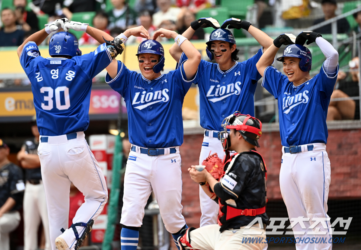 15일 인천SSG랜더스필드에서 열린 삼성과 SSG의 경기, 6회초 2사 만루 삼성 김영웅이 동점 만루홈런을 치고 강민호, 구자욱, 김헌곤과 기쁨을 나누고 있다. 인천=허상욱 기자 wook@sportschosun.com/2024.09.15/