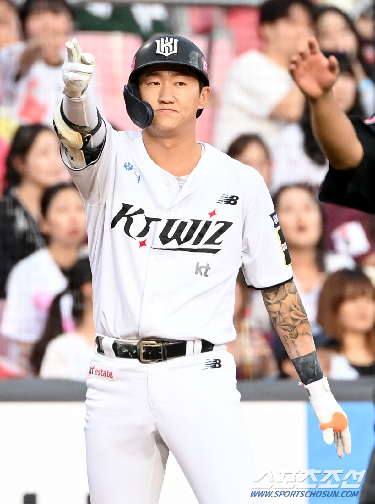 28일 수원KT위즈파크에서 열린 키움과 KT의 경기, 1회말 KT 김민혁이 3루타를 치고 기뻐하고 있다. 수원=허상욱 기자 wook@sportschosun.com/2024.09.28/