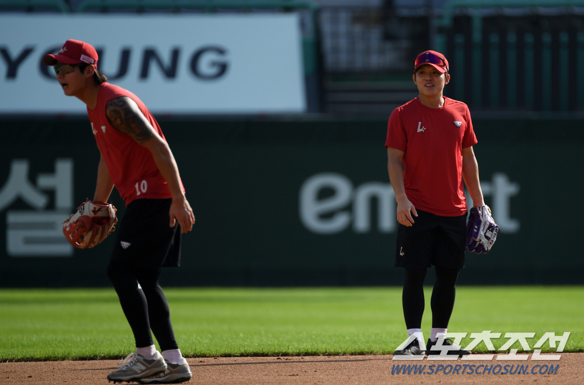 30일 인천 SSG랜더스필드에서 열린 SSG 랜더스와 키움 히어로즈의 경기. SSG 안상현, 정준재가 수비 훈련을 하고 있다. 인천=박재만 기자 pjm@sportschosun.com/2024.09.30/