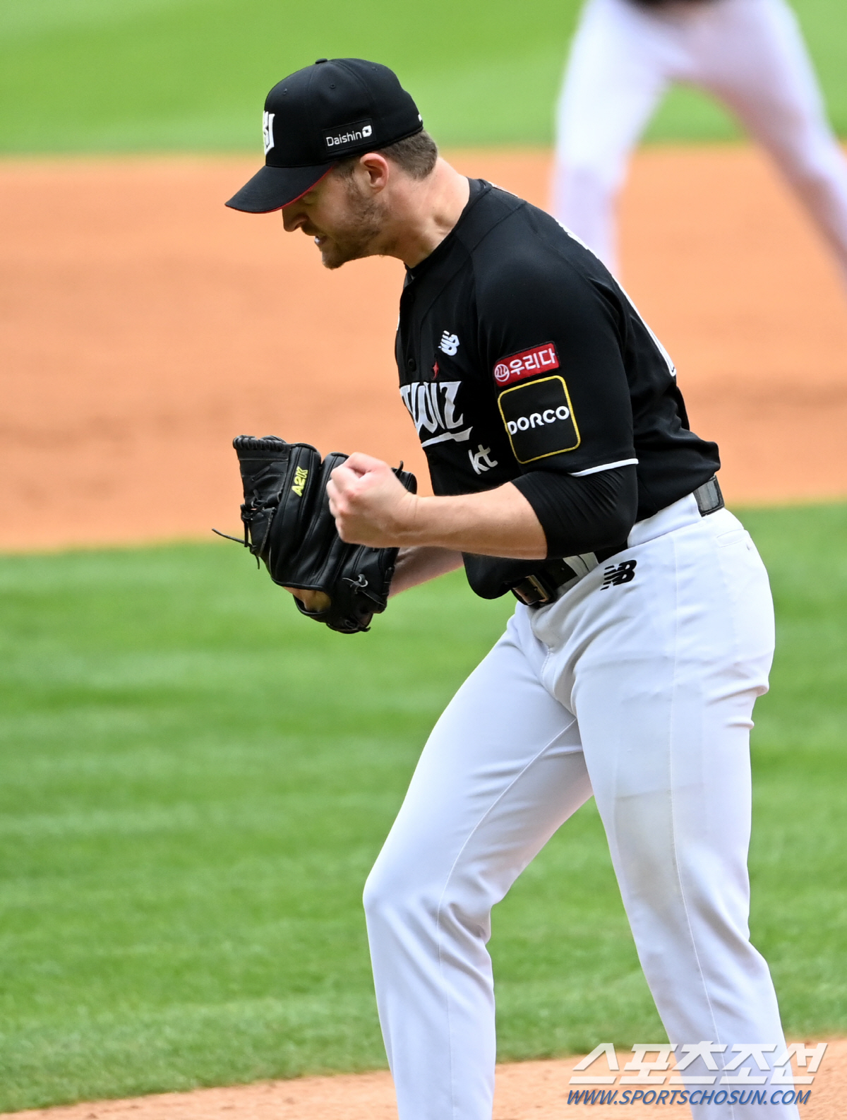 3일 잠실야구장에서 열린 KT와 두산의 와일드카드 2차전, 5회말 2사 2루 KT 벤자민이 두산 김기연의 땅볼타구를 직접 처리해 이닝을 끝낸 후 환호하고 있다. 잠실=허상욱 기자 wook@sportschosun.com/2024.10.03/