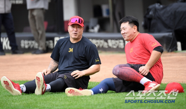 21일 광주 기아챔피언스필드에서 열린 한국시리즈 1차전 KIA 타이거즈와 삼성 라이온즈의 경기. KIA 최형우, 이우성이 몸을 풀고 있다. 광주=박재만 기자 pjm@sportschosun.com/2024.10.21/