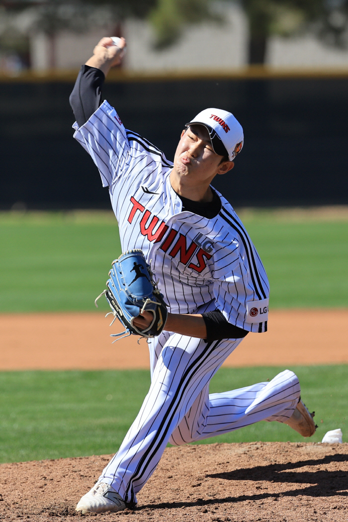 LG 트윈스 1라운드 신인 김영우가 20일(한국시각) 애리조나에서 열린 첫 자체 청백전서 등판해 역투하고 있다. 사진제공=LG 트윈스