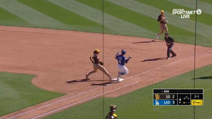 김혜성은 4-3으로 앞선 8회말 세 번째 타석에서는 헛스윙 삼진으로 물러났다. 다저스는 3-3이던 8회 무사 1,2루에서 보티의 적시타로 한 점을 앞선 뒤 무사 1,2루 찬스를 이어갔다. 하지만 김혜성은 볼카운트 2B2S에서 상대 우완 오스틴 데이비스의 6구째 89.1마일 높은 직구에 방망이를 헛돌렸다.