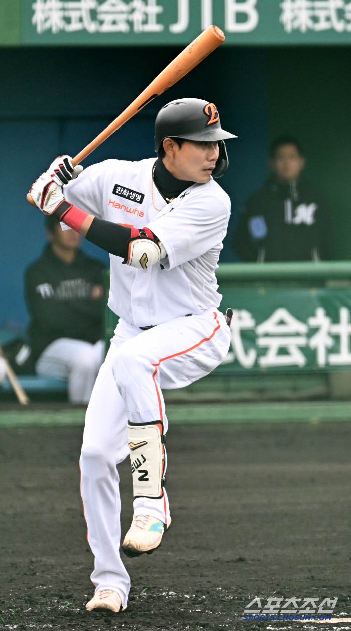 23일 일본 오키나와 이토만 니시자키 야구장에서 열린 한화 이글스와 지바 롯데 마린스의 연습경기, 한화 안치홍이 타격을 하고 있다. 오키나와(일본)=허상욱 기자 wook@sportschosun.com/2025.02.23/