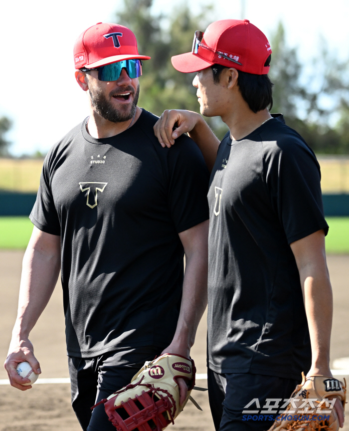 25일 일본 오키나와 킨 스타디움에서 열린 한화와 KIA의 연습경기, KIA 위즈덤과 김규성이 이야기를 나누고 있다. 오키나와(일본)=허상욱 기자 wook@sportschosun.com/2025.02.25/