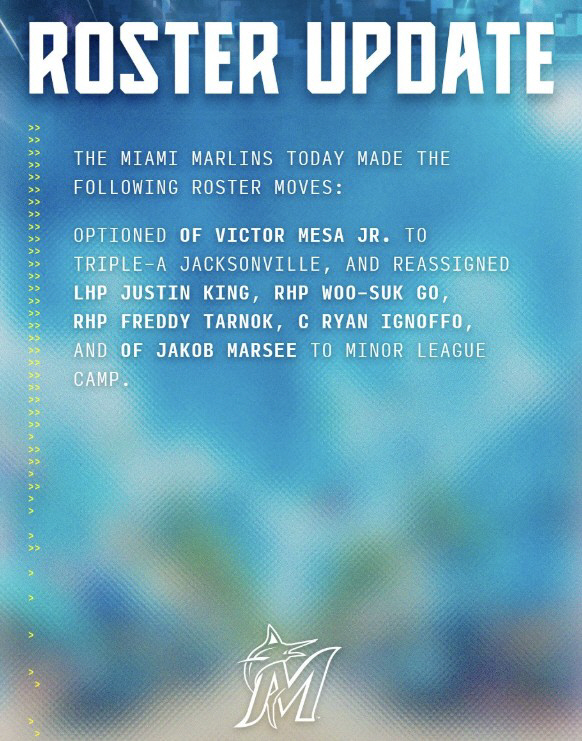 마이매미는 4일(이하 한국시각) '외야수 유망주 빅터 메사 주니어를 비롯해 제이콥 마시, 좌완 저스틴 킹, 우완 고우석과 프레디 타녹, 포수 라이언 이그노포를 마이너리그 캠프로 보냈다'고 발표했다.