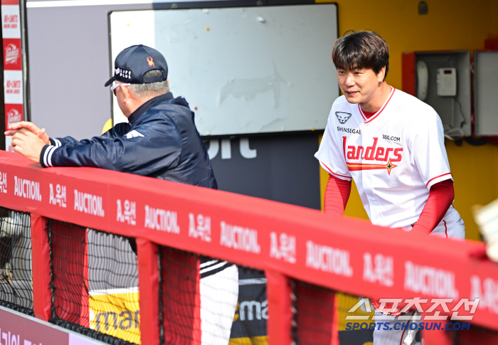 SSG 이숭용 감독과 잠시 대화를 나눈 뒤 다시 더그아웃으로 돌아온 한화 김경문 감독은 훈련을 준비했다. 이때 김 감독을 깜짝 놀라게 만든 사람이 한화 더그아웃 뒤쪽에서 나타났다. 그 주인공은 SSG 김광현이었다.