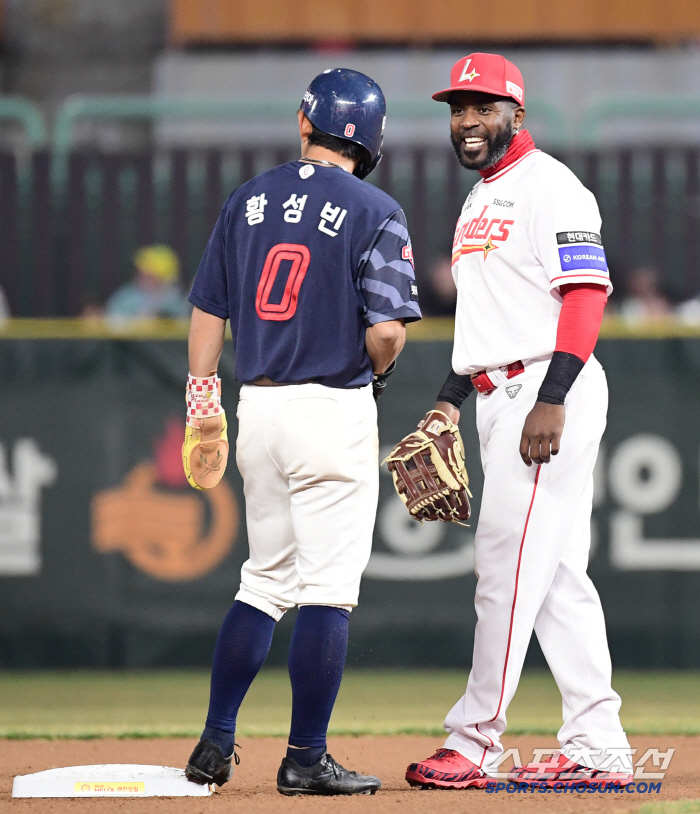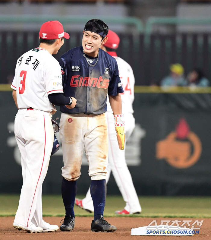 '어메이징' 황성빈 도루 성공에 미소를 짓고 있는 에레디아.