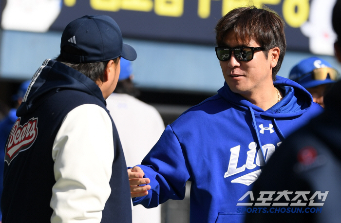 뒤이어 그라운드에 나온 이진영 코치는 이승엽 감독을 찾아가 깍듯하게 인사를 건넨 뒤 한동안 대화를 이어갔다.