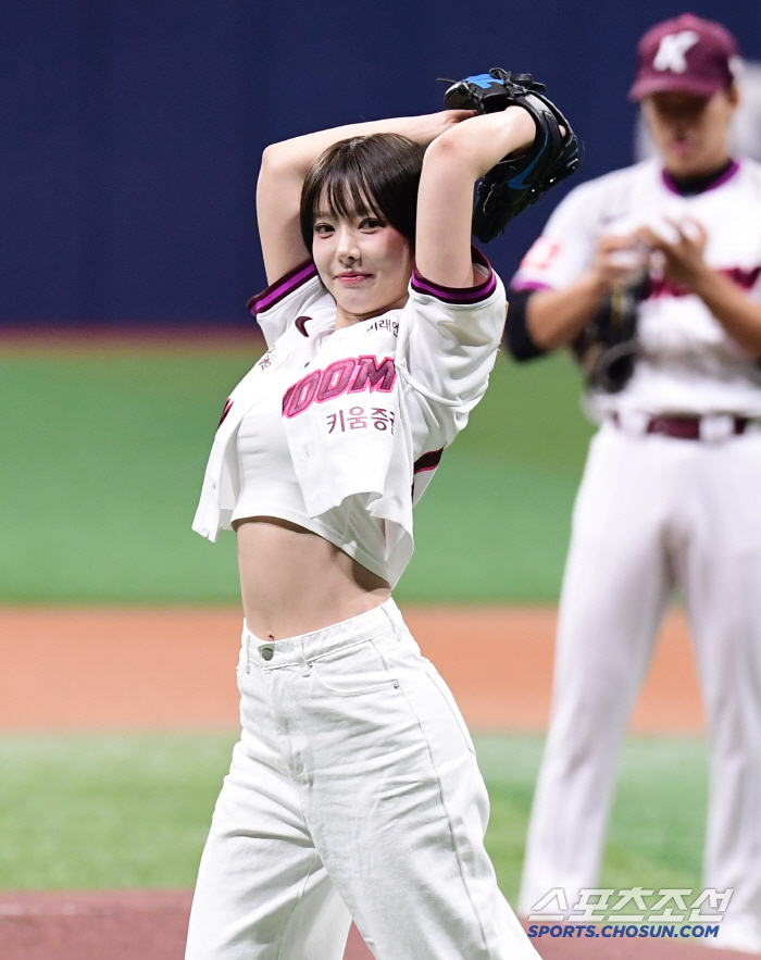 경기를 앞두고 애국가를 부른 초아는 히어로즈 유니폼을 입고 힘찬 시구를 선보였다.