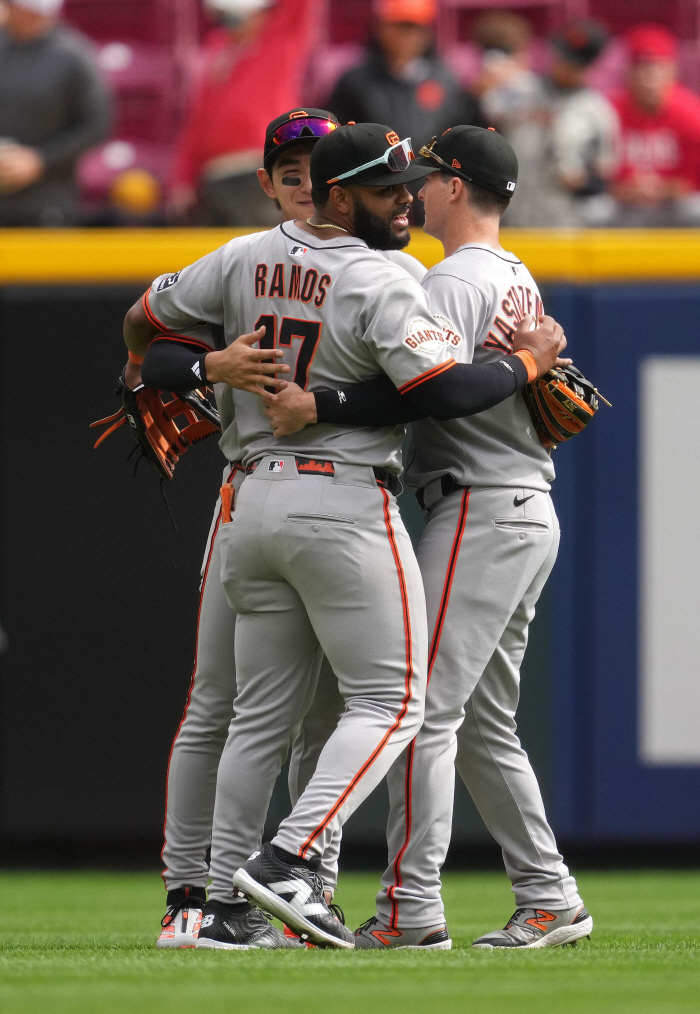 CINCINNATI, OHIO - MARCH 30: Heliot Ramos #17 of the San Francisco Giants celebrates with teammates Jung Hoo Lee #51 and Mike Yastrzemski #5 following a baseball game against the Cincinnati Reds at Great American Ball Park on March 30, 2025 in Cincinnati, Ohio. Jeff Dean/Getty Images/AFP (Photo by Jeff Dean / GETTY IMAGES NORTH AMERICA / Getty Images via AFP)