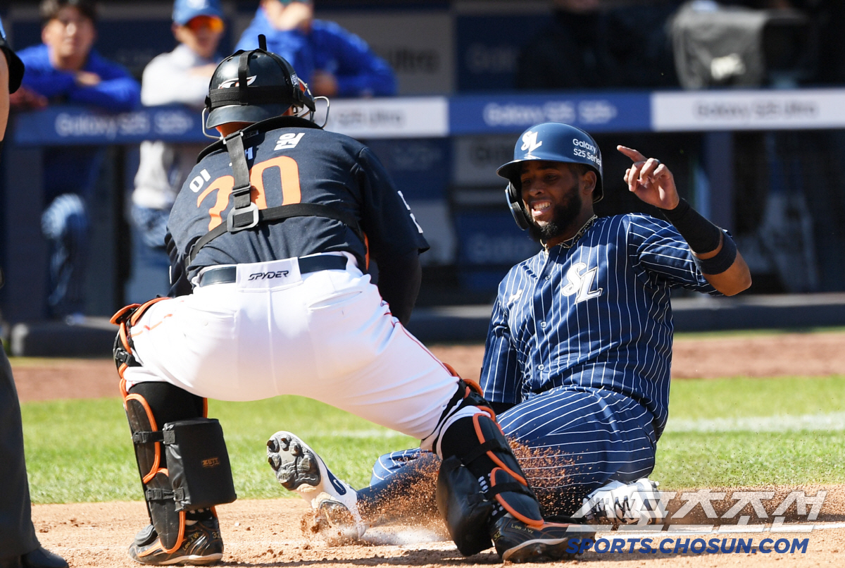 6일 대구 삼성라이온즈파크에서 열린 삼성 라이온즈와 한화 이글스의 경기. 3회말 2사 2루 삼성 디아즈가 박병호 안타 때 홈을 노렸지만 한화 포수 이재원에게 태그 당하고 있다. 대구=박재만 기자 pjm@sportschosun.com/2025.04.06/