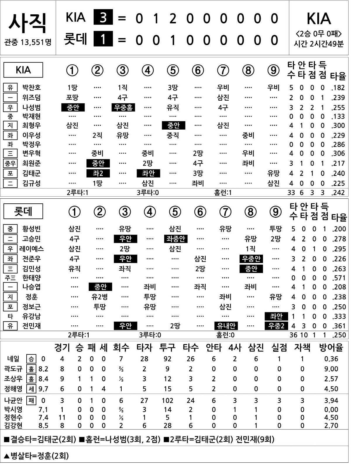 [2025 KBO리그 기록실] KIA vs 롯데 (4월 9일)