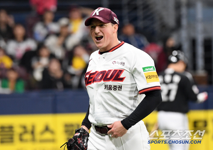 9일 서울 고척스카이돔에서 열린 키움 히어로즈와 LG 트윈스의 경기. 키움 로젠버그가 7회까지 무실점 피칭을 펼친 뒤 미소 짓고 있다. 고척=박재만 기자 pjm@sportschosun.com/2025.04.09/