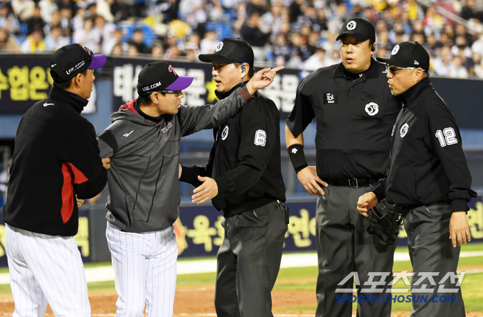 주심의 퇴장 선언에도 염경엽 감독은 그라운드를 떠나지 않고 어필을 이어갔다. 자칫 감정이 더 격해질 수 있던 상황, 김정준 코치와 주장 박해민, 오지환은 달려 나와 염 감독을 말렸다.