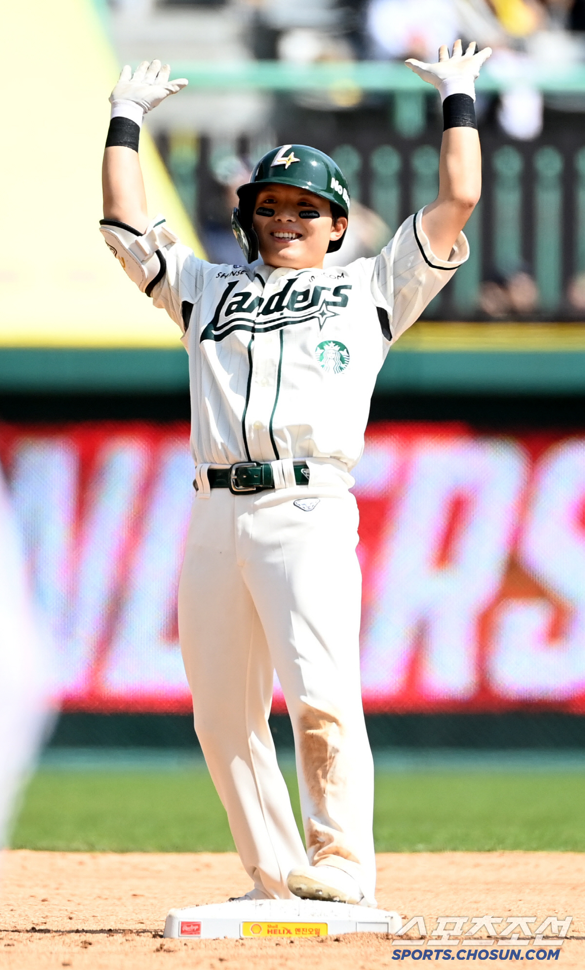 20일 인천SSG랜더스필드에서 열린 SSG와 LG의 경기, 2회말 2사 2루 SSG 정준재가 1타점 2루타를 치고 환호하고 있다. 인천=허상욱 기자wook@sportschosun.com