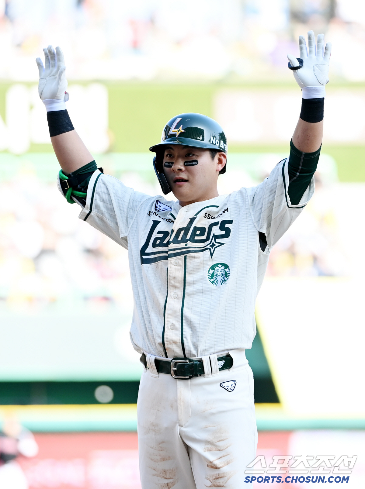 20일 인천SSG랜더스필드에서 열린 SSG와 LG의 경기, 7회말 1사 1,2루 SSG 최준우가 1타점 적시타를 치고 기뻐하고 있다. 인천=허상욱 기자wook@sportschosun.com