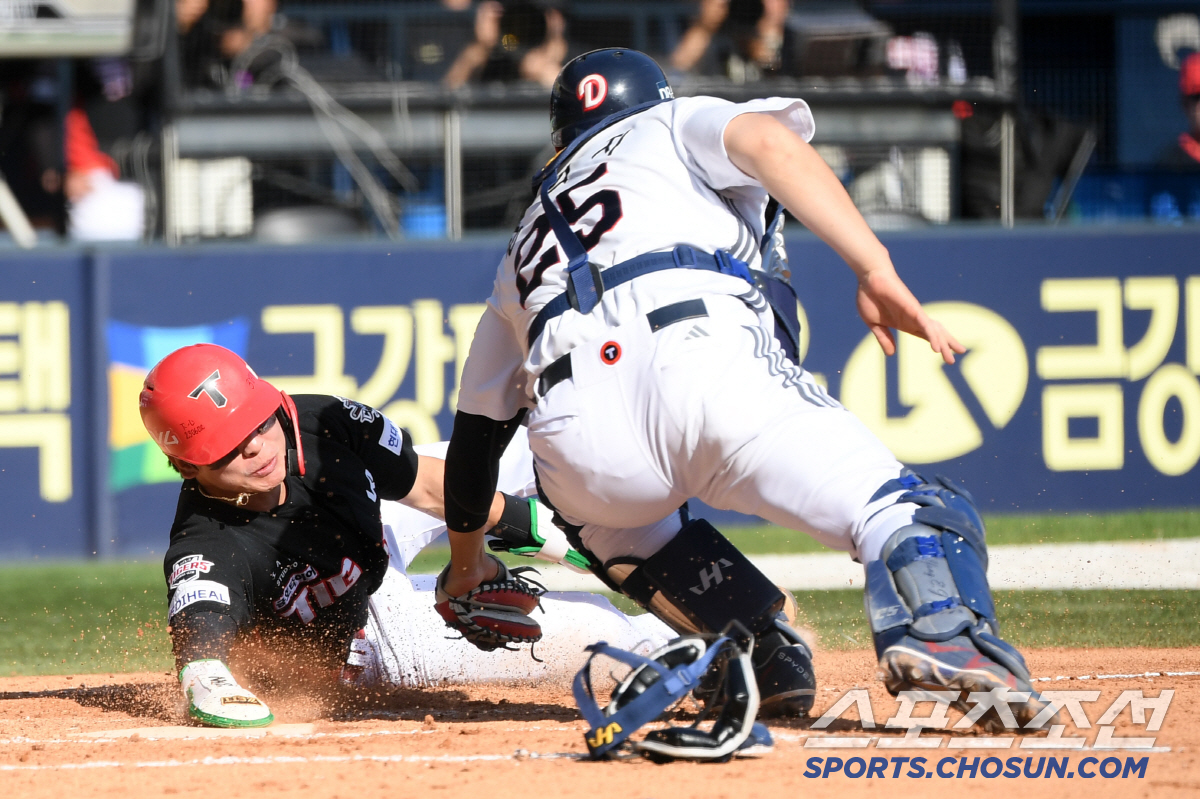20일 잠실구장에서 열린 두산 베어스와 KIA 타이거즈의 경기. 7회초 1사 2,3루 KIA 나성범 2루 땅볼 때 3루 주자 박찬호가 득점을 올리고 있다. 잠실=박재만 기자 pjm@sportschosun.com