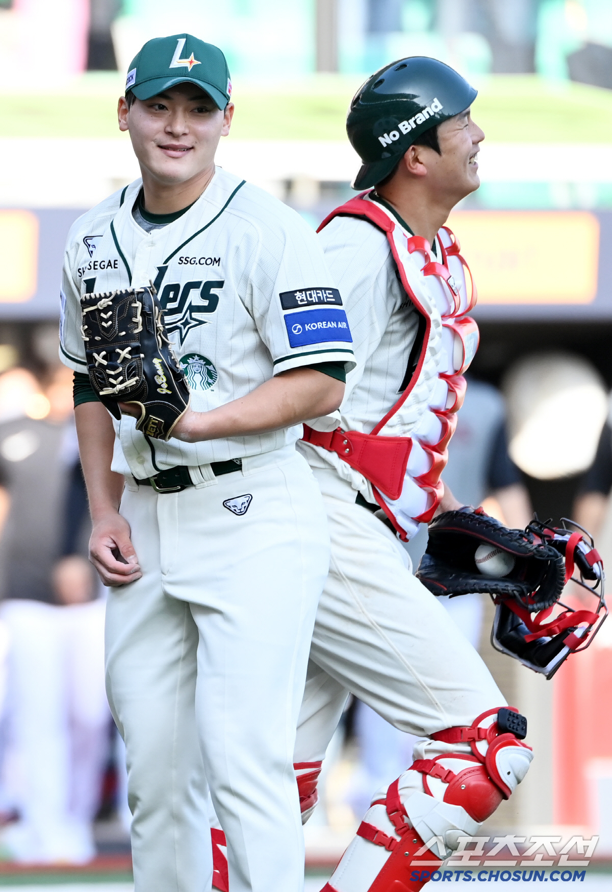 20일 인천SSG랜더스필드에서 열린 SSG와 LG의 경기, SSG가 9대3으로 승리하며 6연패에서 탈출했다. 승리의 기쁨을 나누는 조병현-조형우 배터리의 모습. 인천=허상욱 기자wook@sportschosun.com