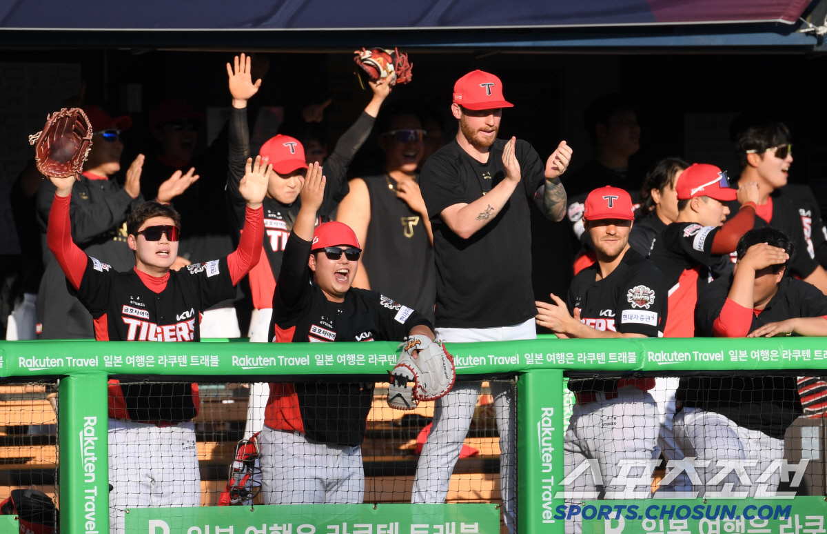 20일 잠실구장에서 열린 두산 베어스와 KIA 타이거즈의 경기. 9회초 두산 포수 양의지 3루 송구 실책을 틈타 KIA 박찬호가 득점을 올리자 더그아웃에서 환호성이 터져 나오고 있다. 잠실=박재만 기자 pjm@sportschosun.com