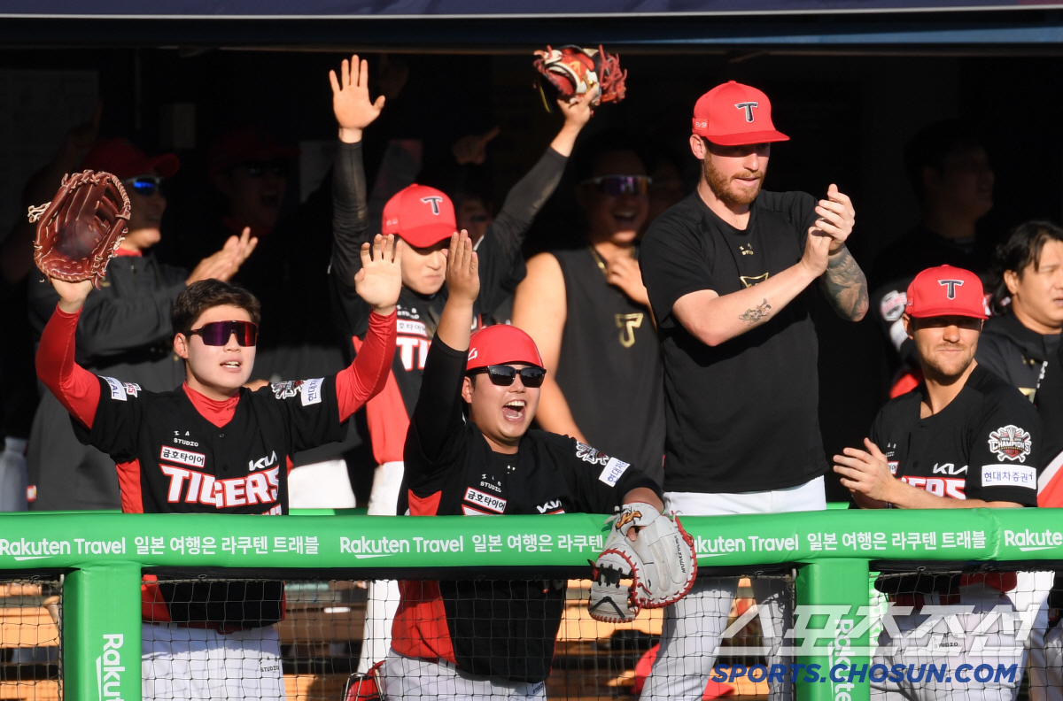 20일 잠실구장에서 열린 두산 베어스와 KIA 타이거즈의 경기. 9회초 두산 포수 양의지 3루 송구 실책을 틈타 KIA 박찬호가 득점을 올리자 더그아웃에서 환호성이 터져 나오고 있다. 잠실=박재만 기자 pjm@sportschosun.com