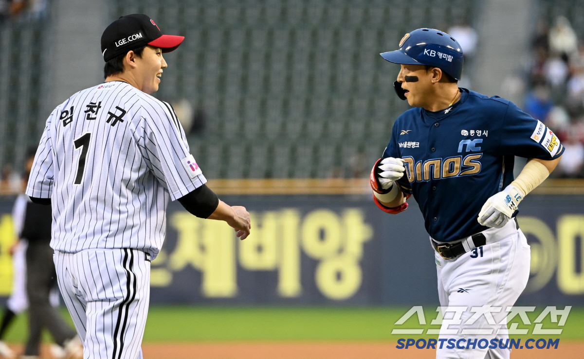 22일 잠실야구장에서 열린 NC와 LG의 경기, 1회초 1사 2루 NC 손아섭이 중견수 플라이로 물러나며 LG 임찬규와 이야기를 하고 있다. 잠실=허상욱 기자wook@sportschosun.com