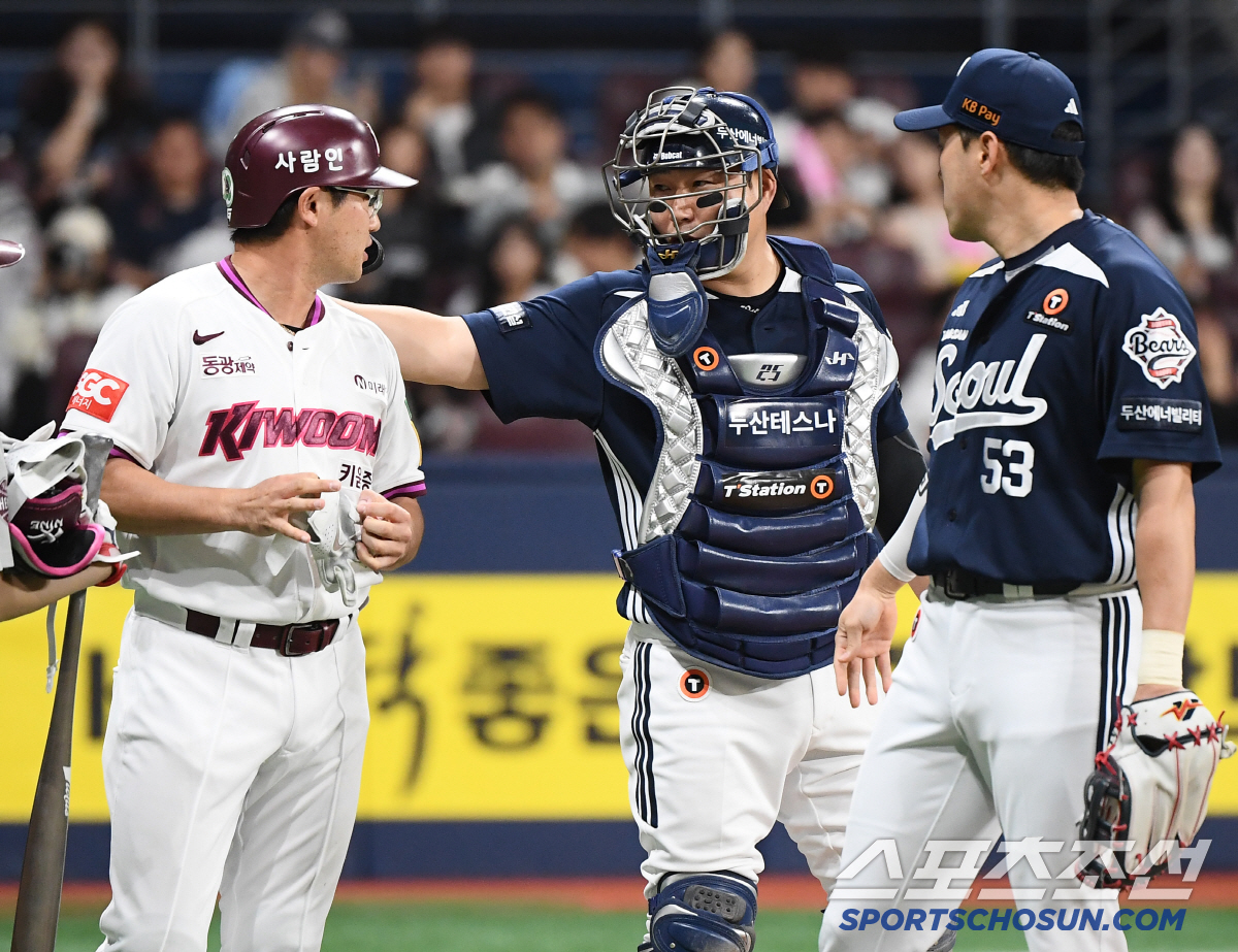 23일 서울 고척스카이돔에서 열린 두산-키움전. 2회말 1사 1루 임지열이 볼넷으로 출루하며 머리쪽으로 날라온 공에 대해 김유성에게 불만을 표했다. 양의지와 양석환이 사과하고 있다. 고척=정재근 기자 cjg@sportschosun.com