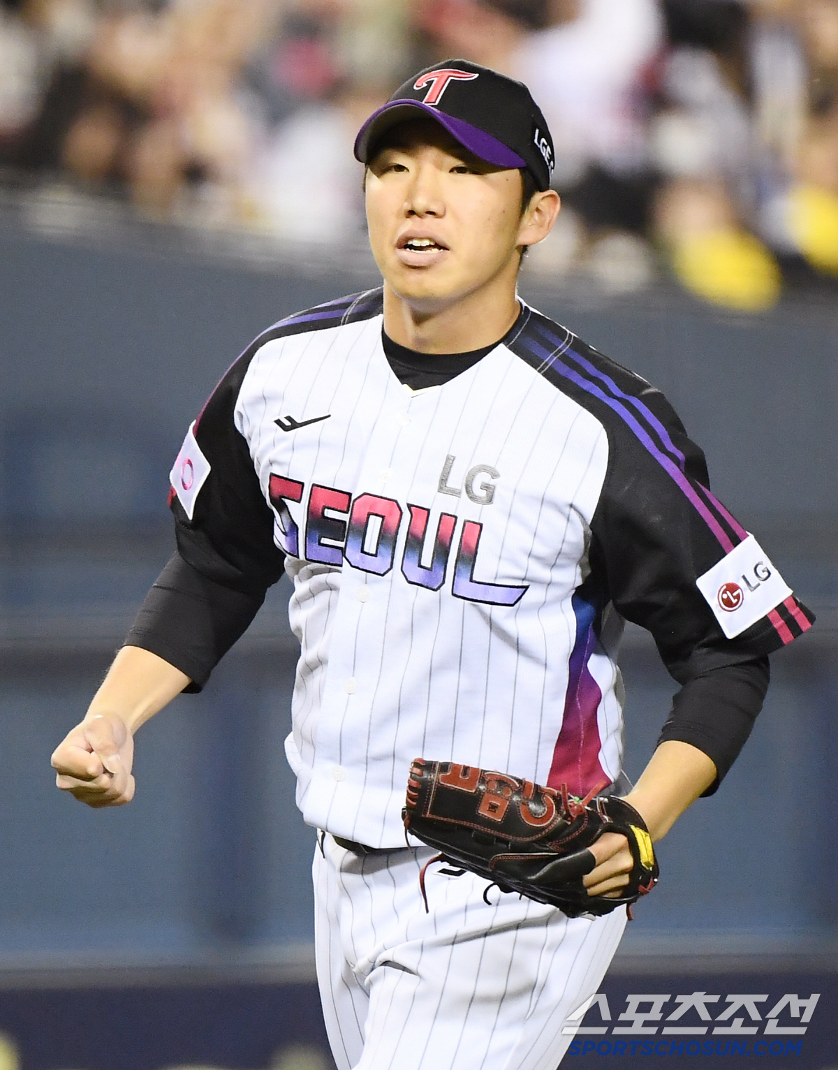 2일 서울 잠실구장에서 열린 SSG-LG전. 6회초 무사 1, 2루에 등판해 무실점으로 막은 박명근이 주먹을 쥐며 환호하고 있다. 잠실=정재근 기자 cjg@sportschosun.com