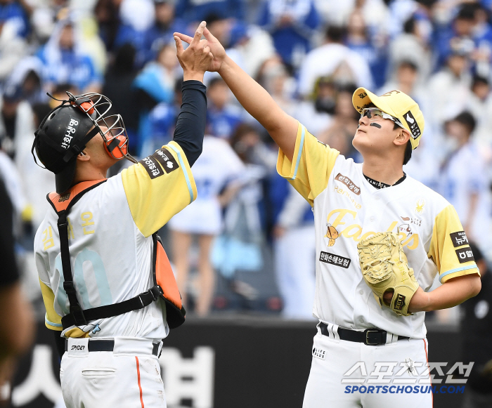5일 대전 한화생명볼파크에서 열린 삼성-한화전. 9회초 김서현이 등판해 3대1 승리를 지킨 후 이재원 포수와 세리머니를 하고 있다. 대전=정재근 기자 cjg@sportschosun.com/2025..5.5/
