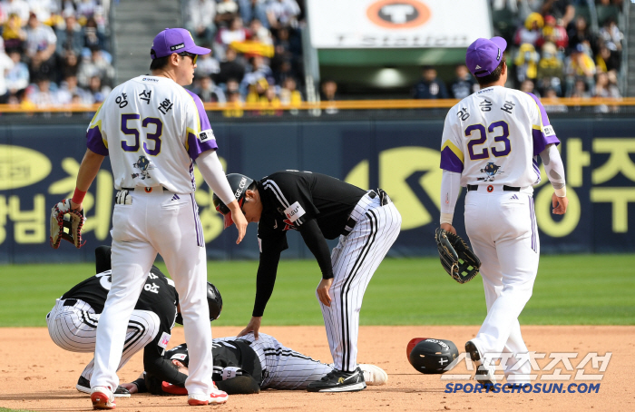 의료진까지 급히 달려 나와 쓰러진 오스틴 상태를 살폈다. 혹시 모를 상황을 대비해 정수성 코치는 오스틴의 목을 손으로 받치고 있었다. 양쪽 선수단이 모두 나와 쓰러진 오스틴을 걱정했다. 2루수 강승호는 미안한 마음에 떨어져 있던 헬멧을 들고 오스틴이 일어나기만을 기다렸다.