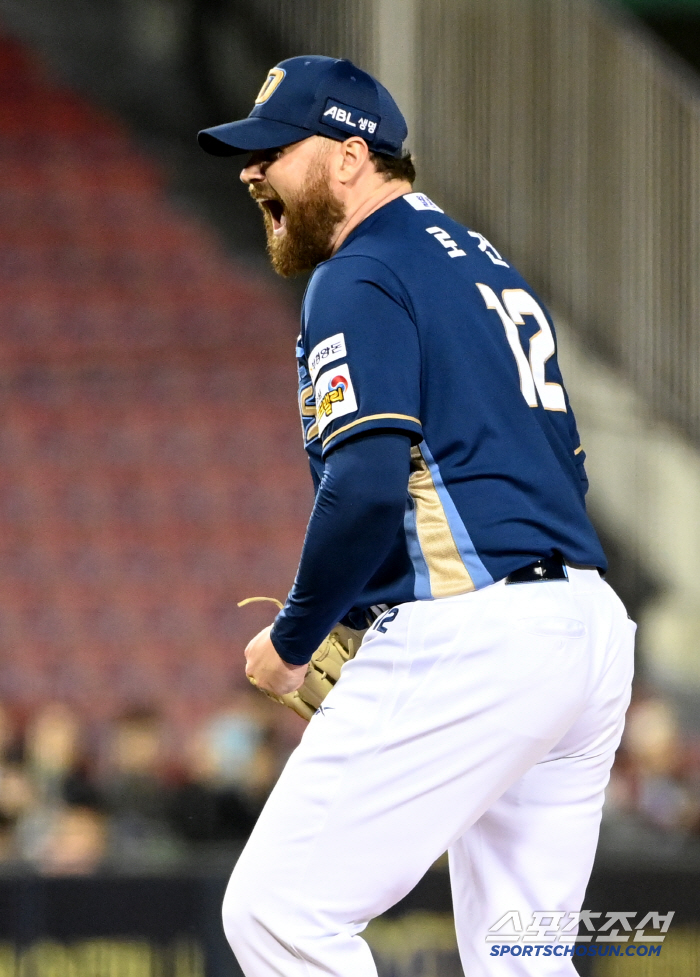 23일 잠실야구장에서 열린 NC와 LG의 경기, 4회말 2사 1,3루 NC 로건이 LG 송찬의를 삼진으로 잡아낸 후 환호하고 있다. 잠실=허상욱 기자wook@sportschosun.com/2025.04.23/