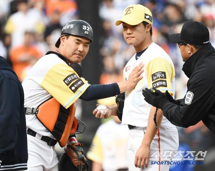 '복수해야죠'라고 농담을 던지자 정우주는 머쓱한 표정으로 "아무리 세게 던져도 저는 안되더라고요"라며 웃었다.