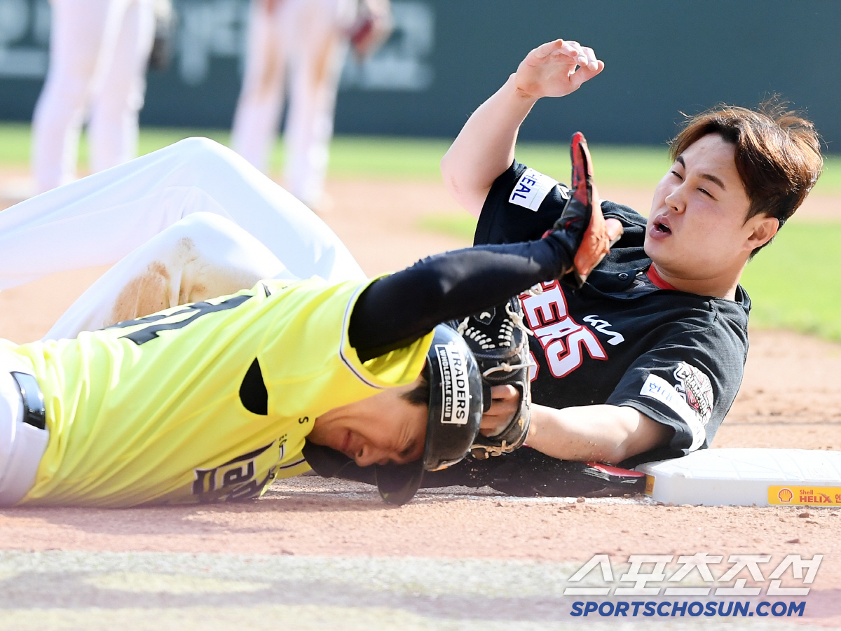 11일 인천 SSG랜더스필드에서 열린 시범경기 KIA-SSG전. 7회말 무사 2루 최준우의 투수앞 땅볼 때 주자 오태곤과 윤중현 투수가 3루에서 충돌했다. 오태곤이 고통스러워하고 있다. 인천=정재근 기자 cjg@sportschosun.com