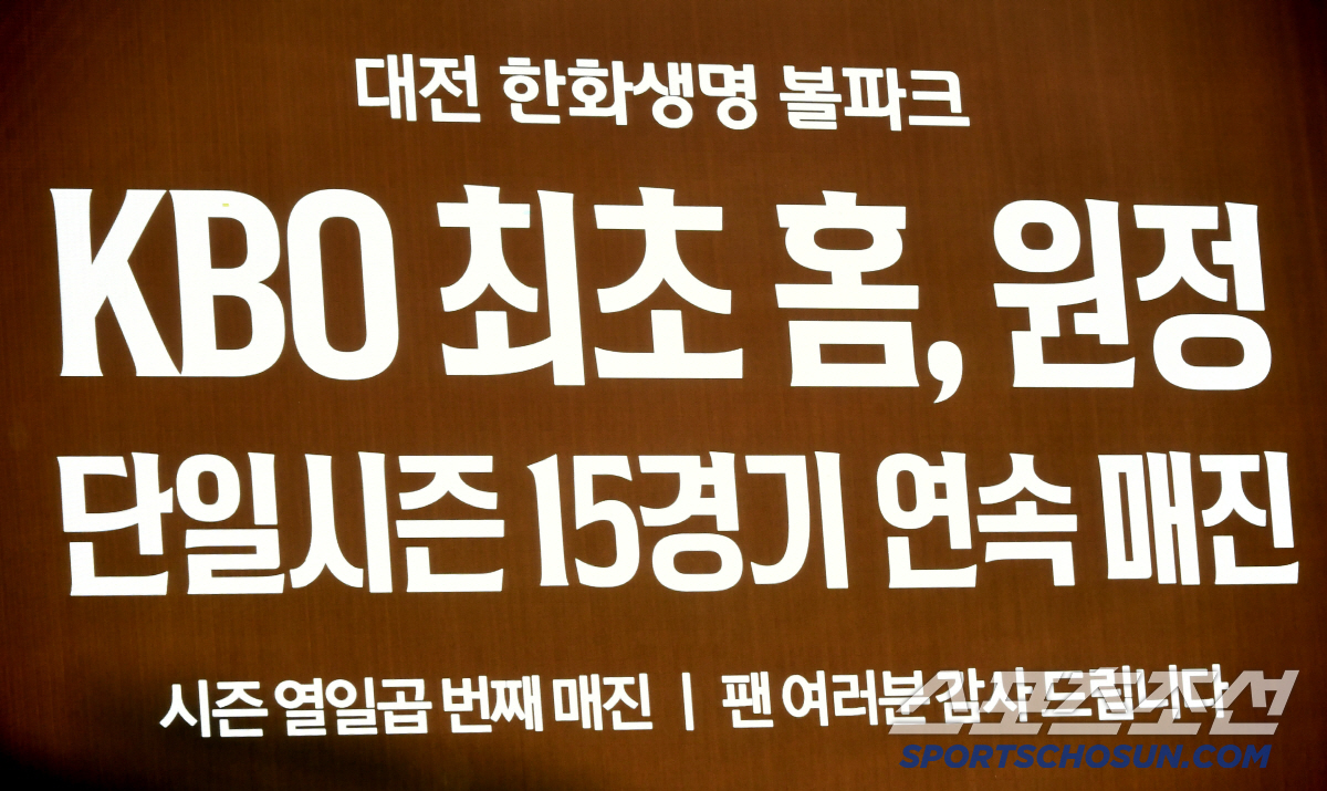 13일 대전 한화생명볼파크에서 열린 두산-한화전.KBO 최초 홈, 원정 단일시즌 15경기 연속 매진을 축하하는 메시지가 전광판에 표시되고 있다. 대전=정재근 기자 cjg@sportschosun.com