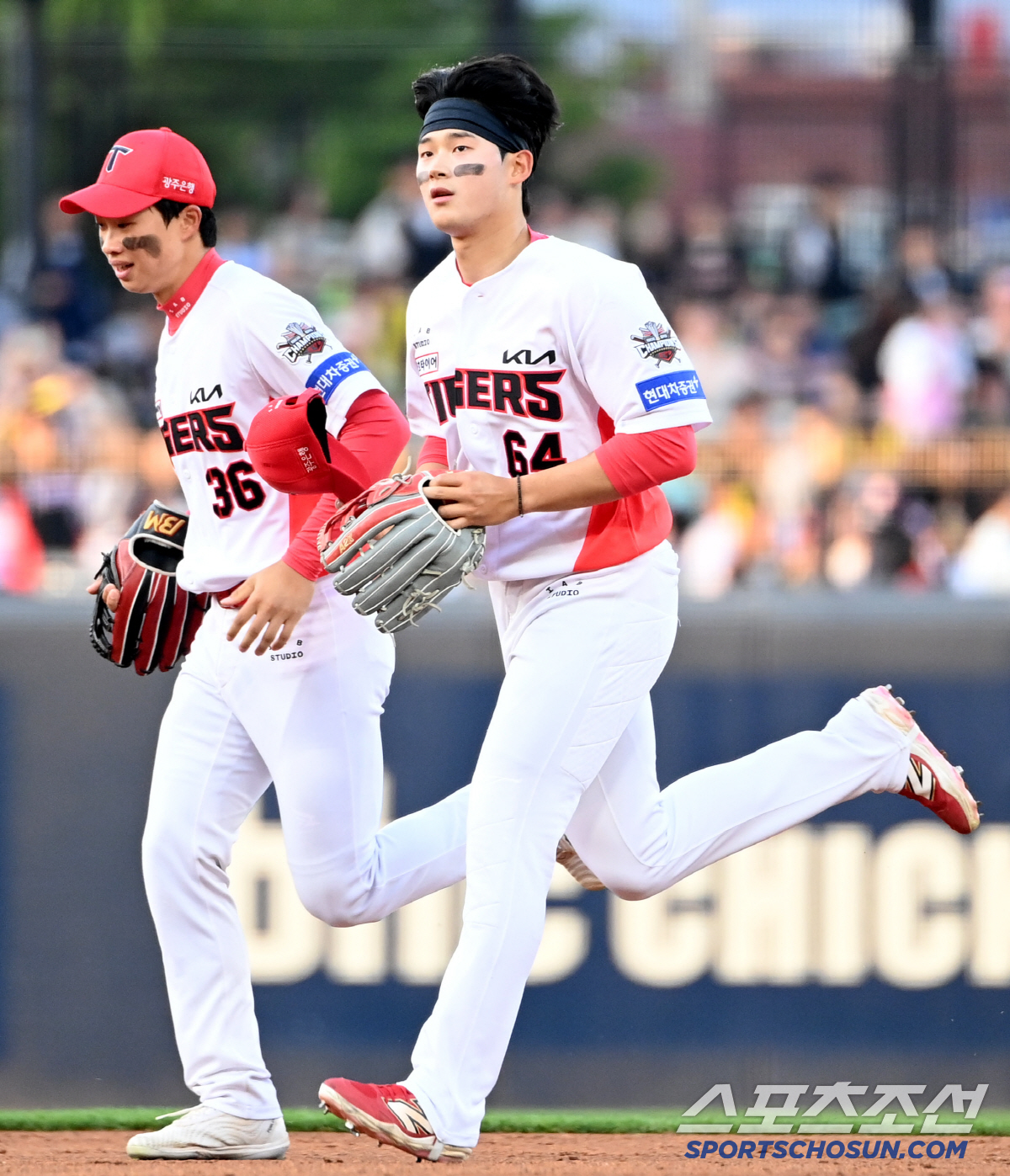 13일 광주KIA챔피언스필드에서 열린 롯데와 KIA의 경기, 2회초 2사 2루 KIA 우익수 정해원이 롯데 박승욱의 큼지막한 타구를 잡아낸 후 박재현과 기쁨을 나누고 있다. 광주=허상욱 기자wook@sportschosun.com