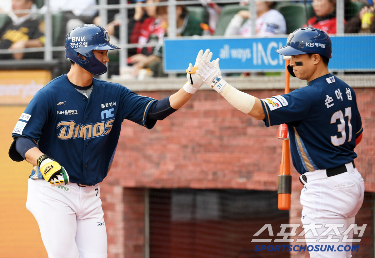 13일 인천 SSG랜더스필드에서 열린 SSG 랜더스와 NC 다이노스의 경기. 1회초 1사 NC 김주원이 솔로포를 날린 뒤 환호하고 있다. 인천=박재만 기자 pjm@sportschosun.com