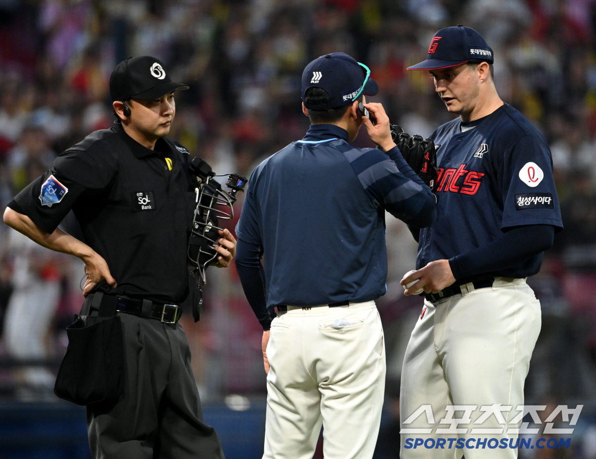 13일 광주KIA챔피언스필드에서 열린 롯데와 KIA의 경기, 4회말 무사 1,3루 롯데 데이비슨이 KIA 변우혁 타석때 피치컴 문제로 애를 먹고 있다. 광주=허상욱 기자wook@sportschosun.com