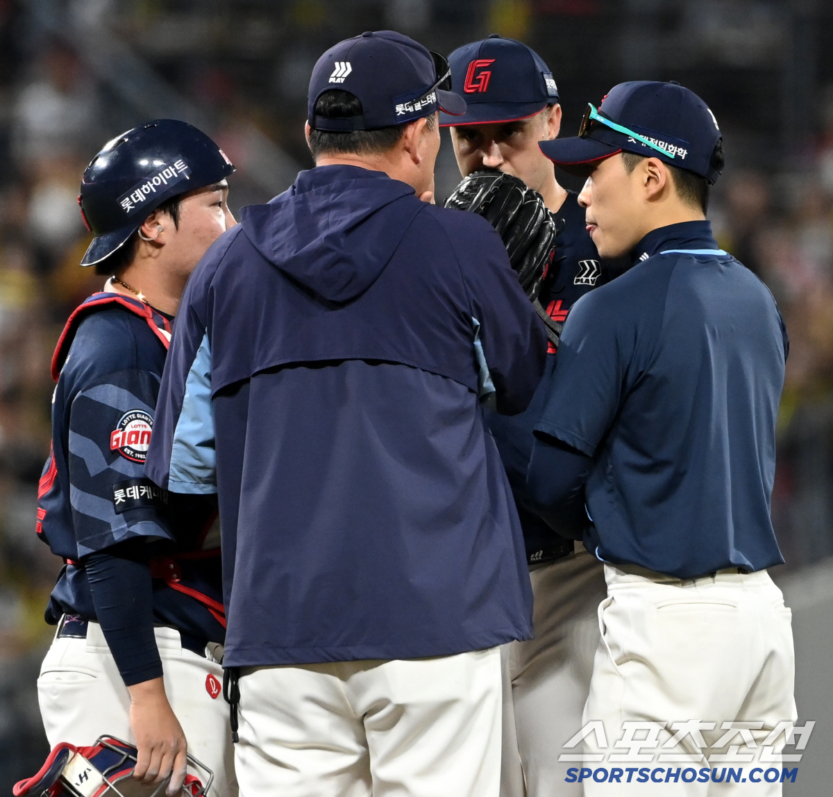 13일 광주KIA챔피언스필드에서 열린 롯데와 KIA의 경기, 5회말 1사 1,2루의 위기를 맞은 롯데 데이비슨이 마운드에 오른 주형광 투수코치와 이야기를 하고 있다. 광주=허상욱 기자wook@sportschosun.com