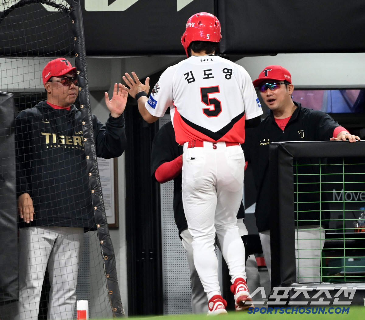 13일 광주KIA챔피언스필드에서 열린 롯데와 KIA의 경기, 5회말 2사,2루 KIA 최형우의 적시타에 득점한 김도영이 이범호 감독과 기쁨을 나누고 있다. 광주=허상욱 기자wook@sportschosun.com