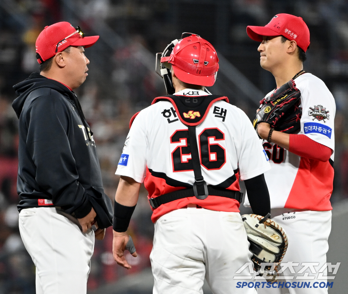 13일 광주KIA챔피언스필드에서 열린 롯데와 KIA의 경기, 6회초 무사 1루 KIA 이범호 감독이 마운드에 올라 김도현과 이야기를 하고 있다. 광주=허상욱 기자wook@sportschosun.com