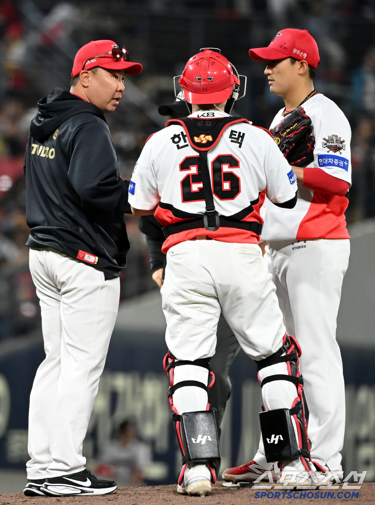 13일 광주KIA챔피언스필드에서 열린 롯데와 KIA의 경기, 6회초 무사 1루 KIA 이범호 감독이 마운드에 올라 김도현 한승택 배터리와 이야기를 하고 있다. 광주=허상욱 기자wook@sportschosun.com