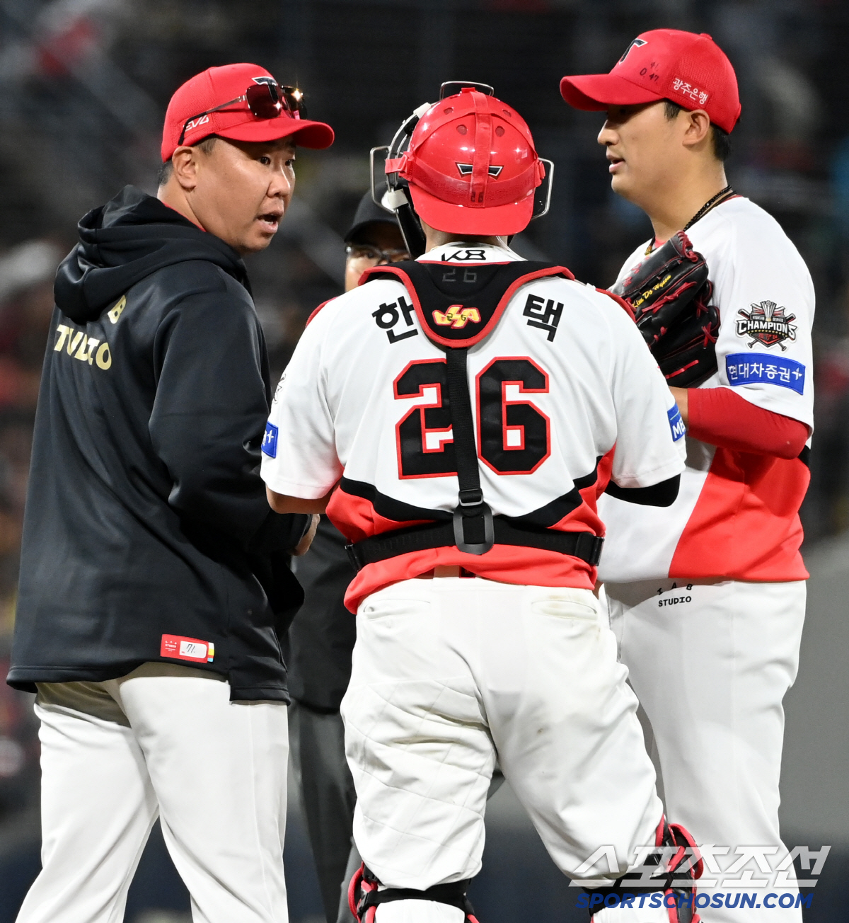 13일 광주KIA챔피언스필드에서 열린 롯데와 KIA의 경기, 6회초 무사 1루 KIA 이범호 감독이 마운드에 올라 김도현 한승택 배터리와 이야기를 하고 있다. 광주=허상욱 기자wook@sportschosun.com