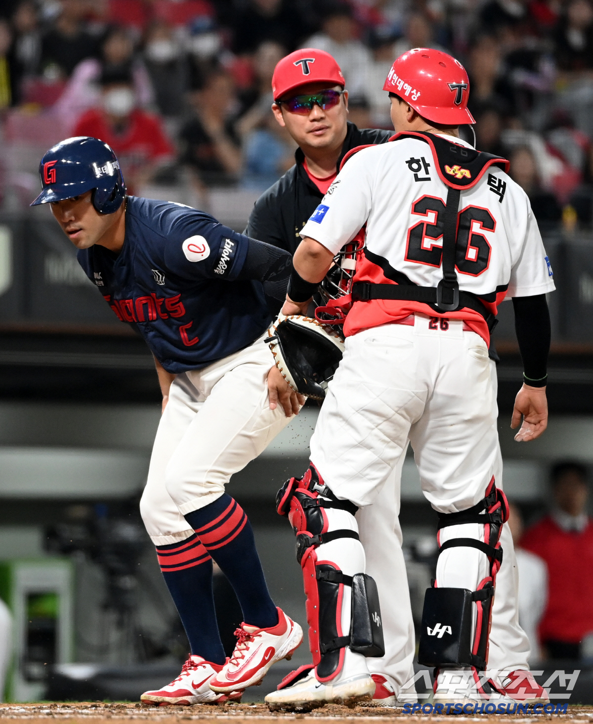13일 광주KIA챔피언스필드에서 열린 롯데와 KIA의 경기, 6회초 1사 1,2루 롯데 전준우가 KIA 김도현의 투구를 몸에 맞자 손승락 수석코치가 나와 사과하고 있다. 광주=허상욱 기자wook@sportschosun.com
