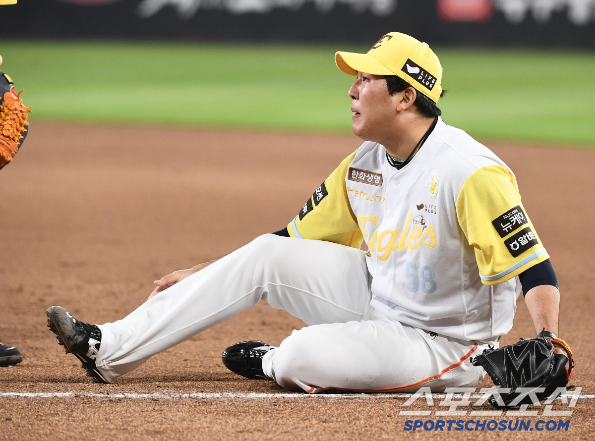 13일 대전 한화생명볼파크에서 열린 두산-한화전. 7회초 2사 김인태의 1루 내야안타 때 베이스커버를 들어간 박상원이 타자의 발에 밟힌 후 고통스러워하고 있다. 대전=정재근 기자 cjg@sportschosun.com