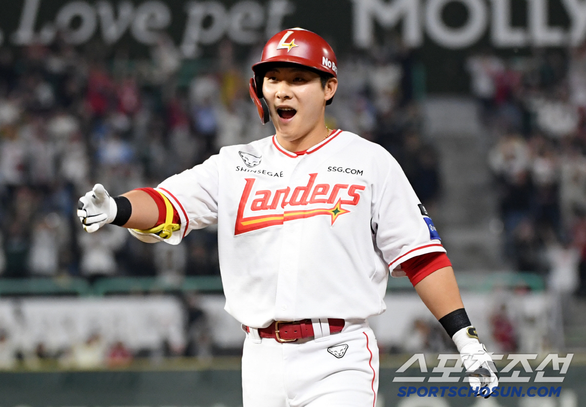 13일 인천 SSG랜더스필드에서 열린 SSG 랜더스와 NC 다이노스의 경기. 8회말 무사 만루 SSG 최준우가 적시타를 날린 뒤 환호하고 있다. 인천=박재만 기자 pjm@sportschosun.com