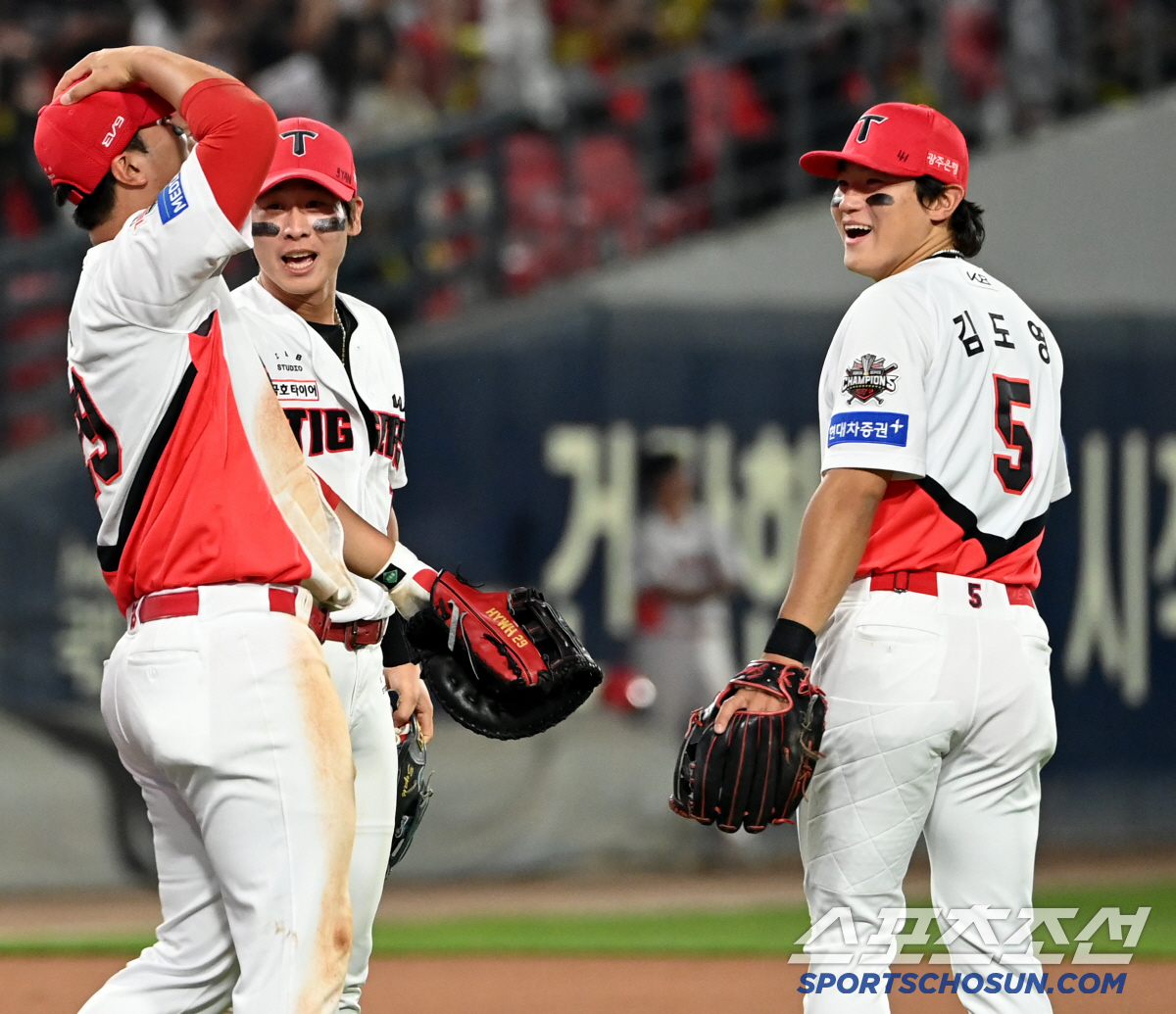 [포토] 박찬호-김도영, 변우혁 호수비에 감탄
