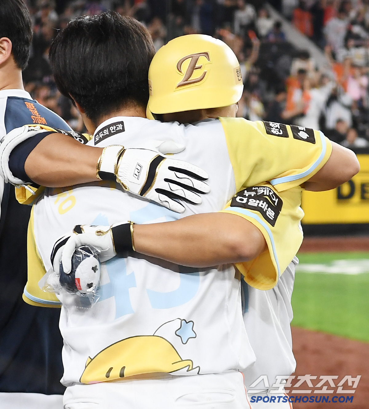 13일 대전 한화생명볼파크에서 열린 두산-한화전. 9회말 2사 1루 최인호가 동점 투런포를 터트린 후 정우주와 포옹하고 있다. 대전=정재근 기자 cjg@sportschosun.com