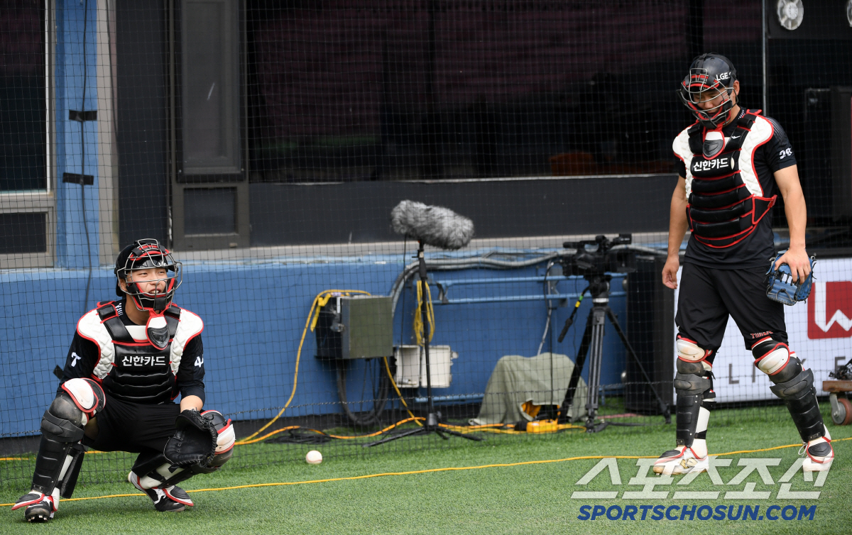15일 잠실구장에서 열린 LG 트윈스와 키움 히어로즈의 경기. LG 포수 김성우, 이주헌이 수비 훈련을 하고 있다. 잠실=박재만 기자 pjm@sportschosun.com/2025.05.15/