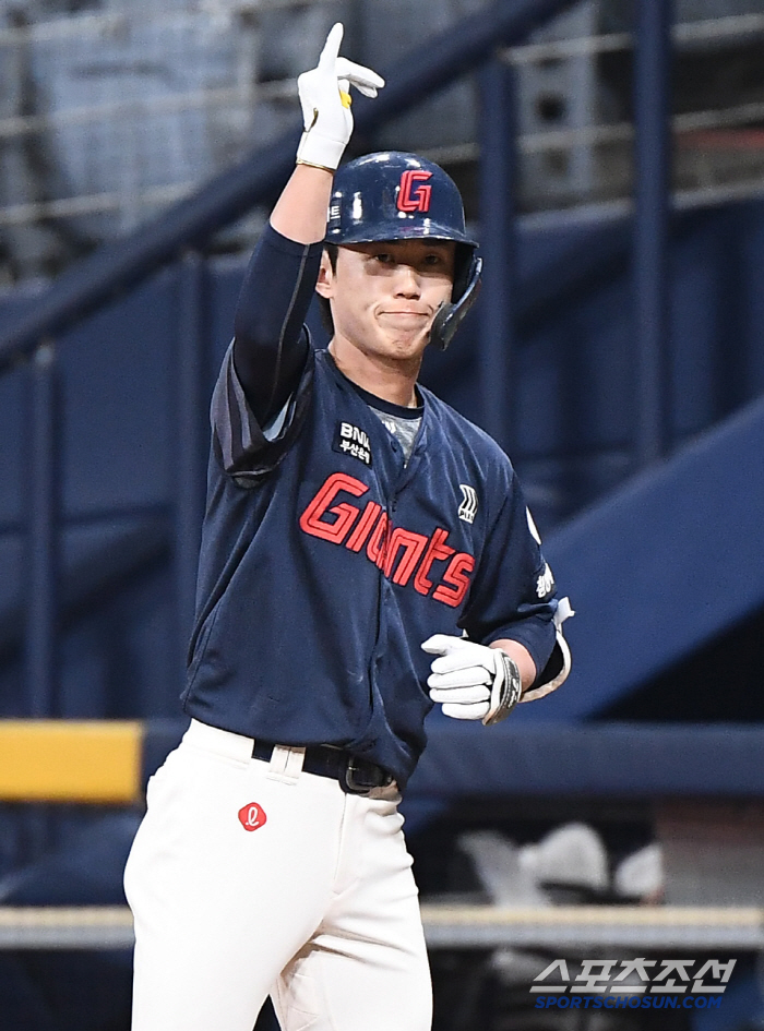 29일 서울 고척스카이돔에서 열린 롯데-키움전. 2회초 1사 2루 전민재가 안타를 친 후 기뻐하고 있다. 고척=정재근 기자 cjg@sportschosun.com/2025.4.29/