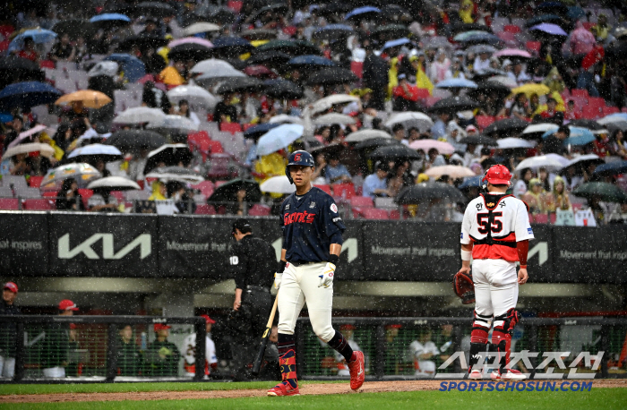 그러나 롯데의 2회초 공격이 시작되고 빗줄기가 다시 굵어지기 시작했다. 2사 후 올러가 박승욱에게 초구 볼을 던진 뒤인 오후 6시 50분 심판진은 우천 중단을 선언했다. 그라운드에는 순식간에 대형 방수포가 깔렸다.